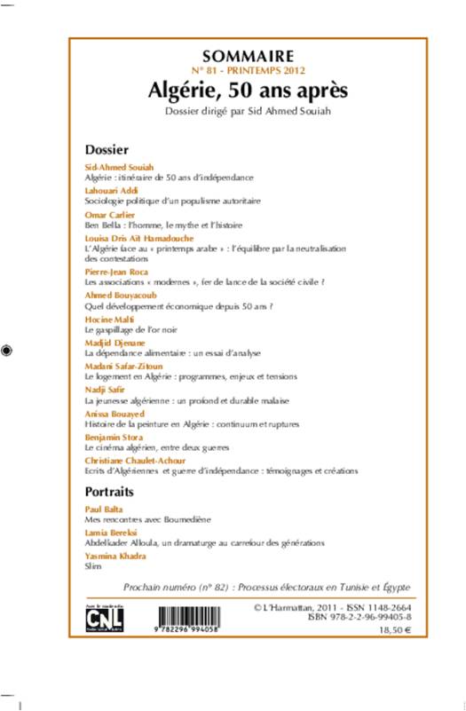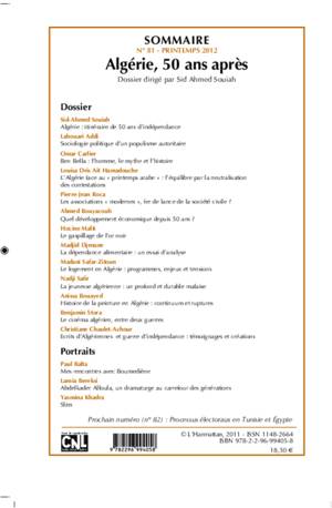 L'Algérie fête cette année les 50 ans de son indépendance, une occasion pour revenir sur son parcours à la fois politique, économique et culturel. Au sommaire notamment de ce numéro des contributions sur Ben Bella, le développement économique depuis 50 ans, le pétrole, la dépendance alimentaire, le logement, la jeunesse, l'histoire de la peinture, le cinéma, la création littéraire.