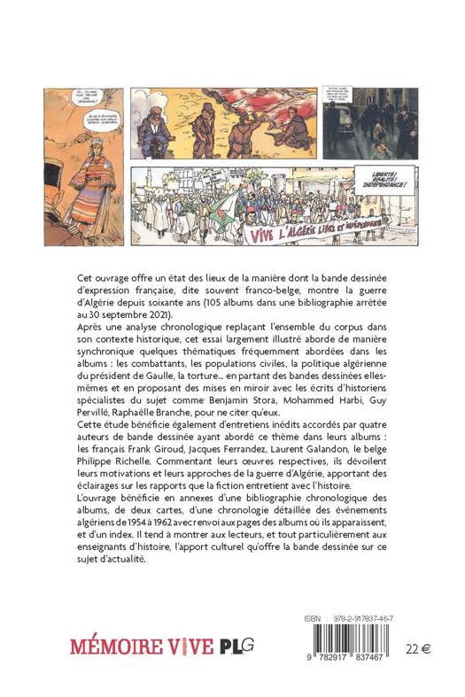 Cet ouvrage offre un état des lieux de la manière dont la bande dessinée d'expression française, dite souvent franco-belge, montre la guerre d'Algérie depuis soixante ans. Après une analyse chronologique replaçant l'ensemble du corpus dans son contexte historique, cet essai largement illustré aborde de manière synchronique quelques thématiques fréquemment abordées dans les albums et en partant des bandes dessinées elles-mêmes et en proposant des mises en miroir avec les écrits d'historiens spécialistes du sujet comme B. Stora, M. Harbi, G. Pervillé, R. Branche, pour ne citer qu'eux. Cette étude bénéficie également d'entretiens inédits accordés par quatre auteurs de bande dessinée ayant abordé ce thème dans leurs albums : les français F. Giroud, J. Ferrandez, L. Galandon, le belge Ph. Richelle