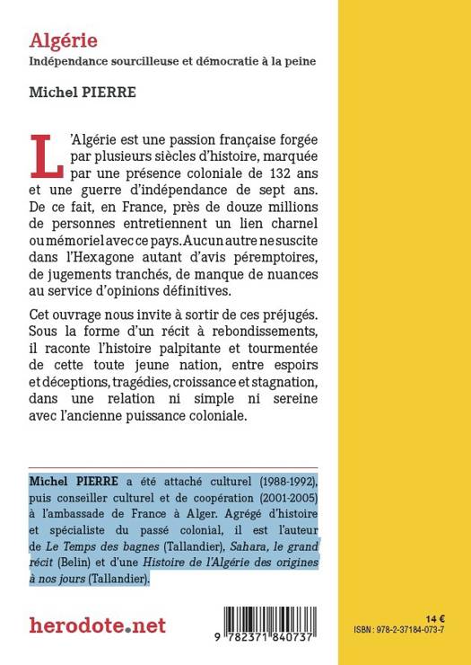 L’Algérie est une passion française forgée par plusieurs siècles d’histoire, marquée par une présence coloniale de 132 ans et une guerre d’indépendance de sept ans.De ce fait, en France, près de douze millions de personnes entretiennent un lien charnel ou mémoriel avec ce pays. Aucun autre ne suscite dans l’Hexagone autant d’avis péremptoires, de jugements tranchés, de manque de nuances au service d’opinions définitives.Cet ouvrage nous invite à sortir de ces préjugés. Sous la forme d’un récit à rebondissements, l'historien Michel PIERRE, spécialiste de l'Algérie et de la colonisation, raconte l’histoire palpitante et tourmentée de cette toute jeune nation, entre espoirs et déceptions, tragédies, croissance et stagnation, dans une relation ni simple ni sereine avec l’ancienne puissance coloniale.