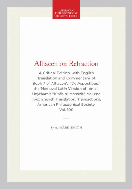 Alhacen's treatment of light and sight in the "De aspectibus" culminates with the analysis of refraction in book 7. Far briefer than his account of reflection, which occupies three books, Alhacen's study of refraction follows essentially the same pattern of analysis, starting with various experiments designed to establish or confirm the governing principles of refraction empirically and proceeding to the application of those principles to specific cases according to the shape of the refracting surface. In many respects, in fact, reflection and refraction are side of the same coin according to Alhacen. Contents of this two-volume set: (1) Intro.: Alhacen's Analysis of Refraction: An Overview; The Prolemaic Underpinnings of Alhacen's Refraction Analysis; The Fate of Alhacen's Refraction Analysis in the Latin West; Putting Alhacen in His Proper Place; (2) Manuscripts and Editing; (3) Latin Text; (4) English Translation. Glossary and Biblio. Illus.