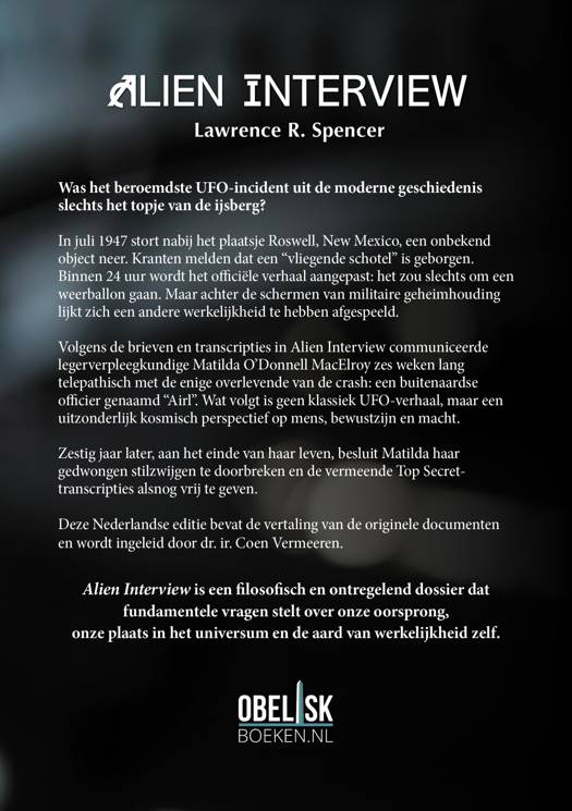 Volgens de brieven en transcripties in Alien Interview communiceerde legerverpleegkundige Matilda O’Donnell MacElroy zes weken lang telepathisch met de enige overlevende van de crash: een buitenaardse officier genaamd “Airl”. Wat volgt is geen klassiek UFO-verhaal, maar een uitzonderlijk kosmisch perspectief op mens, bewustzijn en macht.