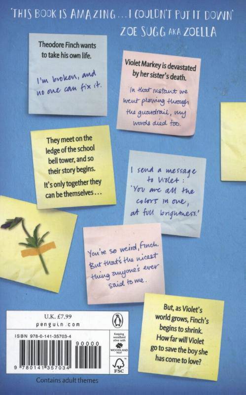 Theodore Finch is fascinated by death, and he constantly thinks of ways he might kill himself. But each time, something good, no matter how small, stops him. Violet Markey lives for the future, counting the days until graduation, when she can escape her Indiana town and her aching grief in the wake of her sister's recent death.
