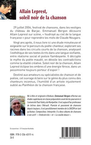 29 juillet 2004, festival de chansons, dans les vestiges du château de Barjac. Emmanuel Bergon découvre Allain Leprest sur scène, foudroyé au ciel de la langue française pour reprendre les mots de Claude Nougaro. Vingt ans après, il nous livre ici une étude minutieuse et exigeante sur le parcours du poète-chanteur, explorant ses racines dans les circuits courts de la chanson, analysant l'esthétique de ses textes écrits dans une langue vivifiante, entre réalisme social et poésie flamboyante. Il décrypte le mythe du poète maudit, en dévoile les contradictions comme la vitalité créative. Soleil noir de la chanson, Allain Leprest éclipse les ombres d'une énergie féroce, dans un pessimisme toujours porteur d'espoir ! Destiné aux amateurs ou spécialistes de chanson et de poésie, cet ouvrage éclaire sur le génie du plus connu des chanteurs inconnus, l'humilité d'un artiste injustement oublié au Panthéon de la chanson française.