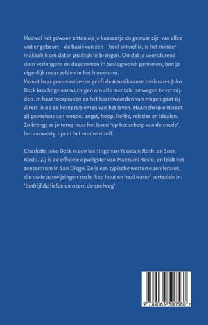 Vanuit haar geen-onzin-zen geeft de Amerikaanse zenlerares Joko Beck krachtige aanwijzingen om alle mentale omwegen te vermijden. In haar toespraken en het beantwoorden van vragen gaat zij direct in op de kernproblemen van het leven. Haarscherp ontleedt zij gevoelens van woede, angst, hoop, liefde, relaties en idealen. Zo brengt ze je terug naar het leven ‘op het scherp van de snede’, het aanwezig zijn in het moment zelf.