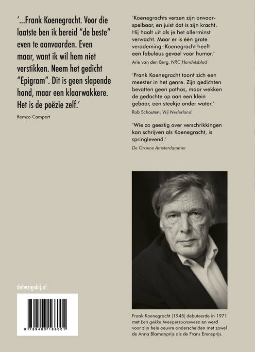 ‘Dichten is geen wedstrijd, ook al kun je er prijzen mee winnen,’ schreef Remco Campert eens, ‘maar daarmee ben je nog niet de beste. Dat begrip bestaat niet in de poëzie.’ Hij mijmert verder en levert zich over aan een gedachtegang. ‘Misschien zou je Gorter de beste dichter van de Lage Landen kunnen noemen, maar daar komen Lucebert, Kouwenaar, Van Ostaijen en Claus al aangesneld. En Frank Koenegracht. Voor die laatste ben ik bereid “de beste” even te aanvaarden. Even maar, want ik wil hem niet verstikken. Dit overkwam me bij nauwkeurige herlezing van Koenegrachts verzamelbundel. Neem het gedicht Epigram.