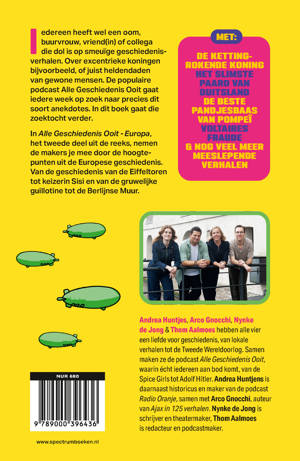 In Alle Geschiedenis Ooit - Europa, het tweede deel uit de reeks, nemen Arco Gnocchi, Nynke de Jong, Thom Aalmoes en Andrea Huntjens je mee door de hoogtepunten uit de Europese geschiedenis. Van de geschiedenis van de Eiffeltoren tot keizerin Sissi en van de gruwelijke guillotine tot de Berlijnse muur. Reis via de verhalen naar bijzondere bestemmingen waar geschiedenis werd geschreven.