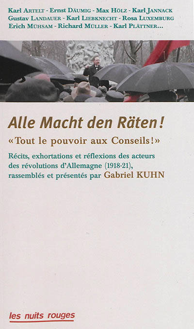 « Alle Macht den Räten ! » Récits, témoignages et observations des acteurs des révolutions d'Allemagne (1918-21) Tout le pouvoir aux Conseils ! compile des documents originaux rédigés par des participants actifs, représentant toutes les tendances impliquées dans la révolution allemande, qu'ils soient communistes, anarchistes ou syndicalistes. Le livre a autant de chapitres que de révoltes/révolutions régionales. Il s'ouvre sur les révoltes des marins de Wilelmshaven et de Kiel début novembre 1918, et se termine sur l'épopée du « bandit communiste » Max Hölz en 1922. Dans cette compilation de textes très peu connus, les récits et documents priment sur les analyses. C'est la révolution telle qu'elle s'est faite, et non telle qu'elle aurait dû se faire. Textes de Karl Artelt, Ernst Däumig, Max Hölz, Karl Jannack, Gustav Landauer, Karl Liebknecht, Rosa Luxemburg, Richard Müller, Erich Muhsam, Karl Plättner, etc.
