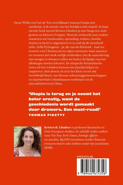 Oscar Wilde wist het al: ‘Een wereldkaart waarop Utopia niet voorkomt is de moeite van het bekijken niet waard.’ In haar nieuwe boek neemt Kristen Ghodsee je mee langs een stoet grotere en kleinere Utopia’s. Want de zoektocht naar andere manieren om huishouden, opvoeding, relaties, familie, wonen en bezit te organiseren is zo oud als de mensheid zelve. Zelfs Pythagoras – ja, die van de driehoek – had zes eeuwen voor Christus al een eigen commune waar mannen en vrouwen het werk eerlijk verdeelden. Om de samenleving van morgen te dromen zullen we buiten de lijntjes van het alledaagse moeten kleuren. De utopische feministische visies uit het verleden kunnen ons daarbij helpen en inspireren. Hun desem zit al in het klein verzet dat wereldwijd bloeit, van Deense cohousinggemeenschappen en matriarchale Colombiaanse ecodorpen tot de microdistricten in China. ‘Utopia is terug’, aldus een enthousiaste Thomas Piketty, ‘en je neemt het beter ernstig want de geschiedenis wordt gemaakt door dromers. Een must-read!’