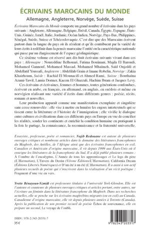 Poursuivant les recherches sur les écrivains marocains de la diaspora, ce volume 6 est réservé aux dix-huit écrivains suivants vivant dans ces pays : Allemagne : Noureddine Belhouari, Fatima Bouânani, Majda El Baroudi, Mohamed Gannouf, Mohamed Massad, Mohamed Mhaïmeh, Saïd Oujeddi et Abdellatif Youssafi, Angleterre : Abdelilah Grain et Imane Robelin, Norvège : Zakia Khairhoum, Suède : Rachid El Mounacifi et Ahmed Rami, Suisse : Bouthaïna Azami-Tawil, Lamia Dormer, Kacem El Ghazzali, Hachim Ibram et Jacques Levy.