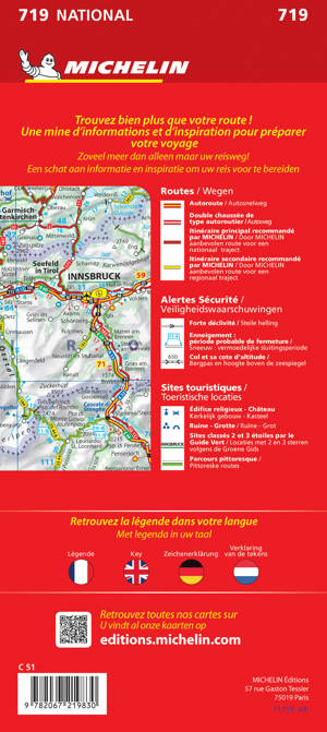 Michelin NATIONAL kaarten bieden een optimaal en nauwkeurig beeld van het land. De betrouwbare weergave van het wegennet voorziet in alle behoeftes, of u nu op zoek bent naar schilderachtige routes of zich snel wilt verplaatsen. De volledige plaatsnamenindex, toeristische informatie en stadplattegronden zijn onmisbare elementen om een reis goed voor te bereiden en te beleven.
