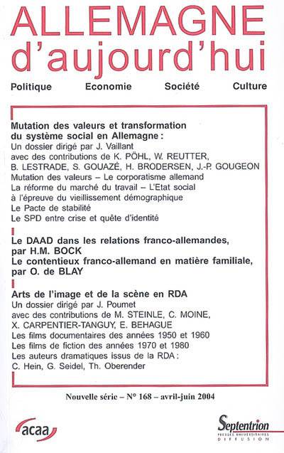 Au sommaire de ce numéro, deux dossiers : Mutation des valeurs et transformation du système social en Allemagne et Arts de l'image et de la scène en RDA.