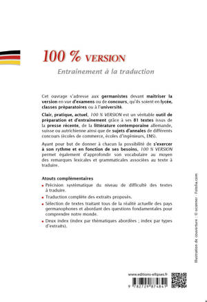 Clair, pratique, actuel, 100 % VERSION est un véritable outil de préparation et d’entraînement grâce à ses 81 textes issus de la presse récente, de la littérature contemporaine allemande, suisse ou autrichienne ainsi que de sujets d’annales de différents concours (écoles de commerce, écoles d’ingénieurs, ENS).