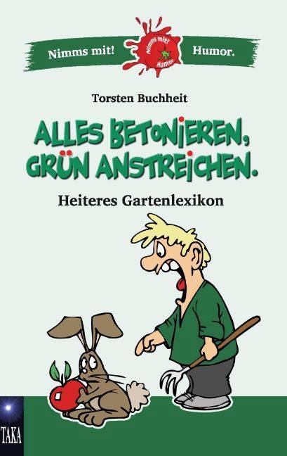 Das Gartenlexikon aus der Heiteren Lexikon-reihe Nimms mit! Humor. von Torsten Buchheit für Menschen mit grünem Daumen. Amüsant und liebevoll ironisch gibt der Autor humorvolle Erklärungen für über 300 Fachbegriffe aus der Welt des Hobbygärtners: von Aasgeier über Dynamit, Komposthaufen, Rasenmähen und Stinktier bis Zwiebel, ergänzt durch schwungvoll gezeichnete Illustrationen.