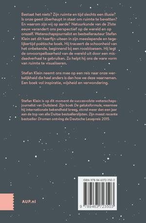 Bestaat het niets? Zijn ruimte en tijd slechts een illusie? Is onze geest überhaupt in staat om ruimte te bevatten? En waarom zijn wij op aarde? Natuurkunde van de 21ste eeuw verandert ons perspectief van de wereld en van onszelf. Wetenschapsjournalist en bestsellerauteur Stefan Klein zet dit haarfijn uiteen in zijn meeslepende en tegelijkertijd poëtische boek. Hij traceert de schoonheid van het onbekende, beginnend bij een roosbloesem. Hij legt de onvoorspelbaarheid van de wereld uit door een misdaadverhaal te gebruiken. Zo helpt hij ons de ware vorm van ruimte te visualiseren.