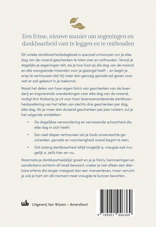 Het is niet altijd makkelijk om je zegeningen te tellen. Soms is het leven grijs en moeizaam. Maar als je leert om meer waarderend om je heen te kijken, helpt dat tegen stress, het verdiept je relaties met anderen en met God en het maakt je weerbaarder. Ann Voskamp helpt je met dit dagboek voor het hele jaar om te oefenen in dankbaarheid en om te leren zien dat er allemaal voor moois om je heen gebeurt. Op elke dag van de maand, 1 t/m 31, vind je een meditatie van Ann, met in het boek schrijfruimte om elke dag drie dingen op te schrijven waar je dankbaar voor bent.