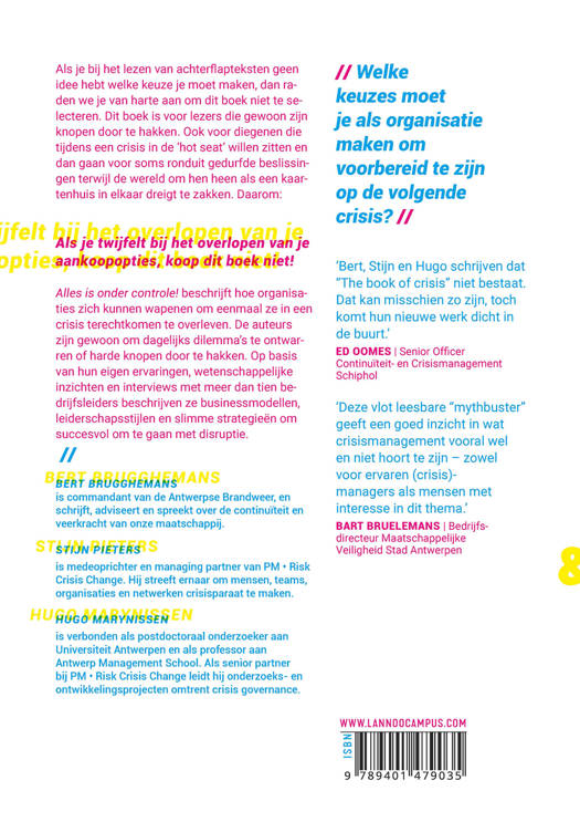 Als je bij het lezen van achterflapteksten geen idee hebt welke keuze je moet maken, dan raden we je van harte aan om dit boek niet te selecteren. Dit boek is voor lezers die gewoon zijn knopen door te hakken. Ook voor diegenen die tijdens een crisis in de 'hot seat' willen zitten en dan gaan voor soms ronduit gedurfde beslissingen terwijl de wereld om hen heen als een kaartenhuis in elkaar dreigt te zakken. Daarom: Als je twijfelt bij het overlopen van je aankoopopties, koop dit boek niet! Alles is onder controle! beschrijft hoe organisaties zich kunnen wapenen om eenmaal ze in een crisis terechtkomen te overleven. De auteurs zijn gewoon om dagelijks dilemma's te ontwarren of harde knopen door te hakken. Op basis van hun eigen ervaringen, wetenschappelijke inzichten en interviews met meer dan tien bedrijfsleiders beschrijven ze businessmodellen, leiderschapsstijlen en slimme strategieën om succesvol om te gaan met disruptie.