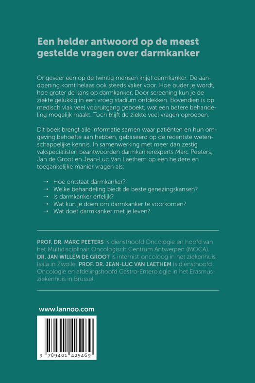 Ongeveer een op de twintig mensen krijgt darmkanker. De aandoening komt helaas ook steeds vaker voor. Hoe ouder je wordt, hoe groter de kans op darmkanker. Door screening kun je de ziekte gelukkig in een vroeg stadium ontdekken. Bovendien is op medisch vlak veel vooruitgang geboekt, wat een betere behandeling mogelijk maakt. Toch blijft de ziekte veel vragen oproepen. Dit boek brengt alle informatie samen waar patiënten en hun omgeving behoefte aan hebben, gebaseerd op de recentste wetenschappelijke kennis. In samenwerking met meer dan zestig vakspecialisten beantwoorden darmkankerexperts Marc Peeters, Jan de Groot en Jean-Luc Van Laethem op een heldere en toegankelijke manier vragen als: - Hoe ontstaat darmkanker? - Welke behandeling biedt de beste genezingskansen? - Is darmkanker erfelijk? - Wat kun je doen om darmkanker te voorkomen? - Wat doet darmkanker met je leven?