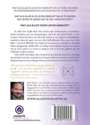 In Alles voor Liefde deelt Matt Kahn zijn revolutionaire, transformerende inzichten om een hartgedragen, door de ziel geleid leven te ontvouwen. Door het lezen van dit boek verken je een diepere werkelijkheid, waarbij je door de ogen van een alles liefhebbende Bron naar het leven kijkt – wat jouw blikveld voor altijd zal verruimen en verhelderen. Dankzij Matts diepgaande, liefdevolle en heilige hartswijsheid word je je bewust van je ware natuur en ervaar je datgene wat in je leven gebeurt op een volkomen andere manier. Matt deelt bovendien zijn energetisch gecodeerde mantra’s, clearings en activaties met jou, waarmee je je energieveld kunt zuiveren, je ziel de leiding kunt geven en je onbegrensde potentieel kunt activeren en ontwaken.