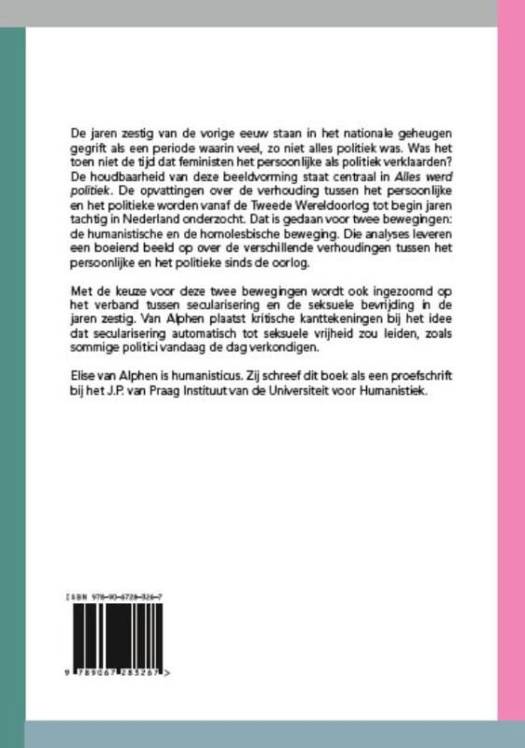 Humanistisch Erfgoed deel 20 De jaren zestig van de vorige eeuw staan in het nationale geheugen gegrift als een periode waarin veel, zo niet alles politiek was. Was het toen niet de tijd dat feministen het persoonlijke als politiek verklaarden? De houdbaarheid van deze beeldvorming staat centraal in "Alles werd politiek". De opvattingen over de verhouding tussen het persoonlijke en het politieke worden vanaf de Tweede Wereldoorlog tot begin jaren tachtig in Nederland onderzocht. Dat is gedaan voor twee bewegingen: de humanistische en de homolesbische beweging. Die analyses leveren een boeiend beeld op over de verschillende verhoudingen tussen het persoonlijke en het politieke sinds de oorlog. Met de keuze voor deze twee bewegingen wordt ook ingezoomd op het verband tussen secularisering en de seksuele bevrijding in de jaren zestig. Van Alphen plaatst kritische kanttekeningen bij het idee dat secularisering automatisch tot seksuele vrijheid zou leiden, zoals sommige politici vandaag de dag verkondigen.