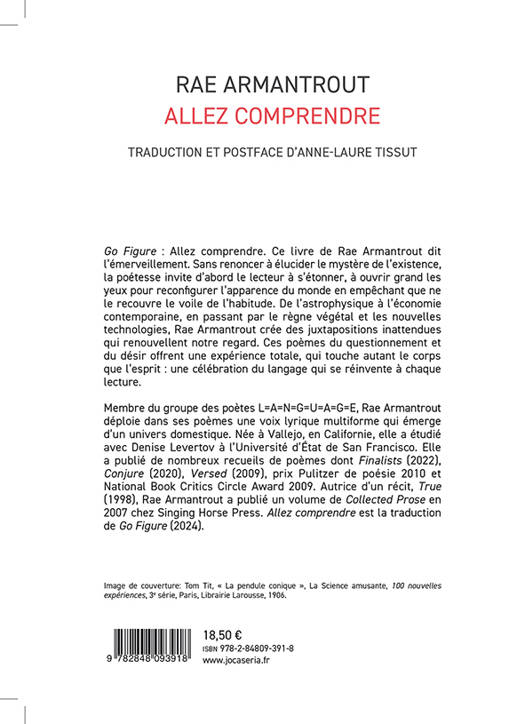 « Allez comprendre » : la perplexité traverse le recueil de Rae Armantrout, face aux menaces que le capitalisme débridé et l’égoïsme attenant font peser sur l’environnement et les valeurs humaines. En phase avec son temps, à l’écoute, et sensible aux plus infimes vibrations comme aux secousses qui ébranlent la planète, Rae Armantrout poursuit l’exploration des êtres, des choses et du langage, avec la gravité d’un regard lucide et la fraîcheur de l’imaginaire enfantin. La précision de sa langue ancre la vision d’un monde frappé par la fragmentation, où l’on subit l’assaut d’incessantes sollicitations. La diversité des objets sur lesquels Armantrout porte son attention reçoivent un regard également plein de délicatesse, qui effleure le monde sans l’érafler, plein d’un humour tendre, même si la critique et l’indignation y apportent parfois une touche plus incisive, et le regret, un soupçon d’amertume. De sa langue éminemment suggestive et sonore, le dernier recueil d’Armantrout engage les lecteurs en poésie : une poésie de la pleine conscience, de l’éclat et de la reliance. Rae Armantrout, née en Californie le 13 avril 1947, est l’autrice de 13 livres de poésie et d’une autobiographie, True (Atelos, 1998). Elle grandit à San Diego. Son père est un militaire alcoolique, sa mère une vendeuse de bonbons dévote. Ses études lui permettent de quitter la ville de son enfance pour travailler auprès de Denise Levertov à Berkeley. C’est là qu’elle rencontrera ses “compatriotes générationnels”, Ron Silliman, Lyn Hejinian, Kit Robinson, Bob Perelman, etc., avec qui élaborera une « autobiographie expérimentale collective » en 10 volumes : The Grand Piano (Mode A, 2006-2010). Son 10e livre, Versed, a reçu le Prix Pulitzer en 2010. Son oeuvre a également fait l’objet de deux anthologies : Veil (Wesleyan University Press, 2001) et Couverture, en français (Les Cahiers de Royaumont, 1991). Elle enseigne actuellement à l’Université de San Diego.