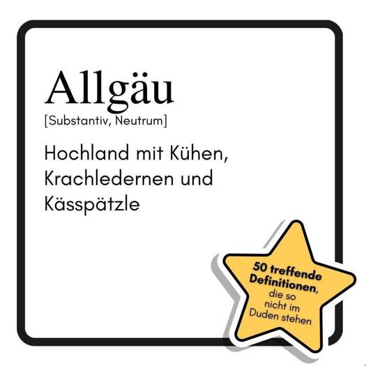 Kühe, Kässpatzen und Krachlederne - das Allgäu ist mehr als nur Postkartenidylle! "Allgäu: Hochland mit Kühen, Krachledernen und Kässpätzle" serviert 50 urkomische Definitionen samt Illustrationen, die zeigen, warum zwischen Nebelhorn und Zwetschgendatschi der Spaß nie zu kurz kommt. Hier wird das Allgäu so beschrieben, wie es wirklich ist: voller Eigenheiten, Traditionen und einer Prise Selbstironie.Für wen dieses Buch optimal geeignet ist:- Für Allgäu-Fans mit Humor und Lust auf neue Perspektiven- Für Heimatliebhaber, die über Klischees schmunzeln können- Für alle, die originelle Geschenke mit Lokalkolorit suchenOb Viehscheid, Föhnwind oder Alphornklang - jede Seite bringt ein Stück Allgäu auf den Punkt. Ein Buch, das Traditionen liebevoll auf die Schippe nimmt und dabei mit witzigen Illustrationen punktet.Was beim Kauf dieses Buches erwartet werden kann:- 50 humorvolle Definitionen rund ums Allgäu- Passende Illustrationen zu jedem Begriff- Ein kreatives Geschenk für Allgäu-Fans- Regionale Eigenheiten mit Augenzwinkern erklärt