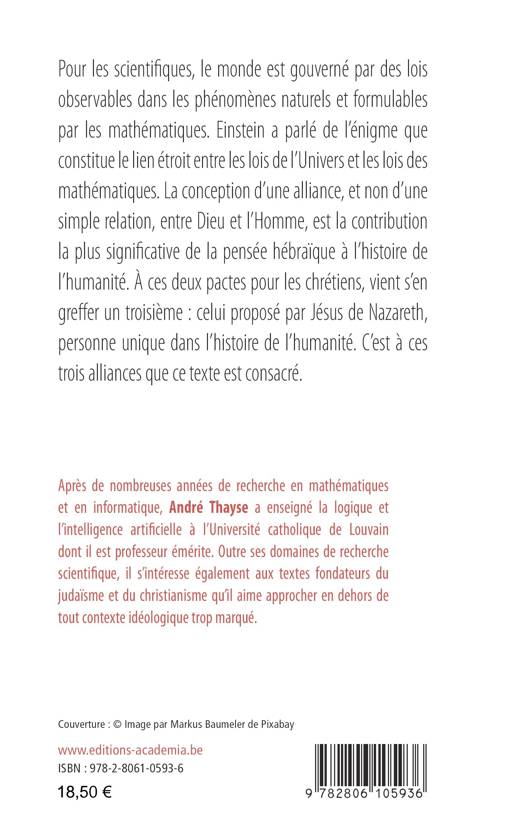 Pour les scientifiques, le monde est gouverné par des lois observables dans les phénomènes naturels et formulables par les mathématiques. Einstein a parlé de l'énigme que constitue le lien étroit entre les lois de l'Univers et les lois des mathématiques. La conception d'une alliance, et non d'une simple relation, entre Dieu et l'Homme, est la contribution la plus significative de la pensée hébraïque à l'histoire de l'humanité. À ces deux pactes pour les chrétiens, vient s'en greffer un troisième : celui proposé par Jésus de Nazareth, personne unique dans l'histoire de l'humanité.