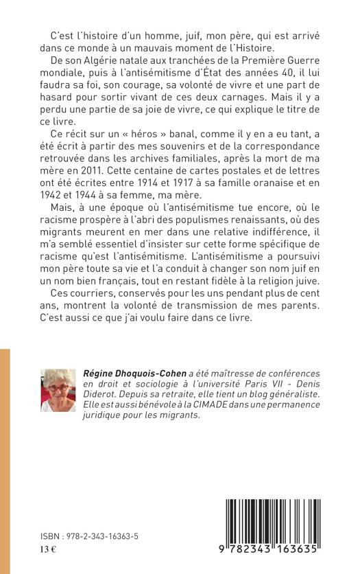 Cet ouvrage marie l'histoire d'un homme de confession juive, un « héros » banal, comme il y en a eu tant, qui est arrivé dans ce monde à un mauvais moment de l'Histoire. De son Algérie natale aux tranchées de la Première Guerre mondiale, puis à l'antisémitisme d'État des années 40, il lui faudra sa foi, son courage, sa volonté de vivre, et aussi une part de hasard pour sortir vivant de ces deux hécatombe du XXème siècle. Mais il y perdie une partie de sa joie de vivre, expliquant le titre de ce livre.