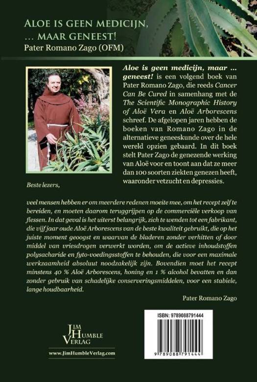 Dit is het 2. boek van Pater Romano Zago, die ook "Aloë arborecsens tegen kanker" en de bijlage "The Scientific Monographic History of Aloë vera and Aloë arborescens" schreef. In de afgelopen jaren hebben de boeken van Romano Zago in de alternatieve geneeskunde over de hele wereld opzien gebaard. In dit boek stelt Pater Zago de genezende werkingen van Aloë voor en toont aan, dat daarmee meer dan 100 soorten ziekten behandeld werden.