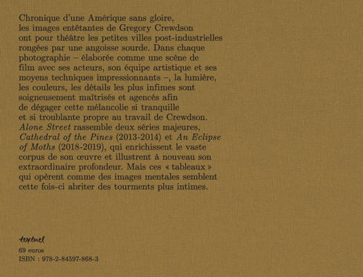 « Des moments suspendus portés par une maîtrise sans faille de la lumière et du cadre. » Télérama « Ce superbe livre met en valeur les deux séries majeures du photographe américain. » Fisheye Chronique d'une Amérique sans gloire, ce livre contient les deux dernières séries inédites de Gregory Crewdson: "Cathedral of the Pines" et " An Eclipse of Moths". Une plongée intense dans des images crépusculaires dévoilant un monde fissuré à la mélancolie tranquille et troublante. Exposition aux Rencontres d'Arles 23.