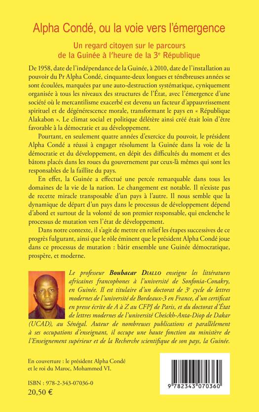 De 1958, indépendance de la Guinée, à 2010, installation au pouvoir du Président Alpha Condé, de ténébreuses années d'auto-destruction se sont écoulées, organisées à tous les niveaux des structures de l'Etat. En dépit du mercantilisme et d'un climat social et politique délétère, Alpha Condé engage toutefois le pays dans la voie de la démocratie et du développement en seulement quatre ans. Cet ouvrage met en relief les étapes successives de ce progrès, et le rôle que le président joue dans la construction d'une Guinée démocratique, prospère et moderne.