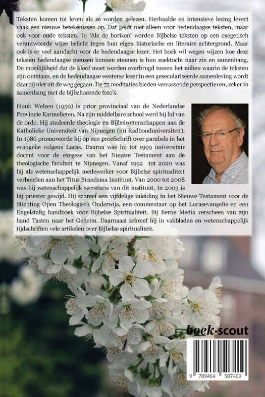 Teksten komen tot leven als ze worden gelezen. Herhaalde en intensieve lezing levert vaak een nieuwe betekenissen op. Dat geldt niet alleen voor hedendaagse teksten, maar ook voor oude teksten. In ‘Als de horizon’ worden Bijbelse teksten op een exegetisch verantwoorde wijze belicht tegen hun eigen historische en literaire achtergrond. Maar ook is er veel aandacht voor de hedendaagse lezer. Het boek wil wegen wijzen hoe deze teksten hedendaagse mensen kunnen steunen is hun zoektocht naar zin en samenhang. De moeilijkheid dat de kloof moet worden overbrugd tussen het milieu waarin de teksten zijn ontstaan, en de hedendaagse westerse lezer in een geseculariseerde samenleving wordt daarbij niet uit de weg gegaan. De 75 meditaties bieden verrassende perspectieven, zeker in samenhang met de bijbehorende foto’s.