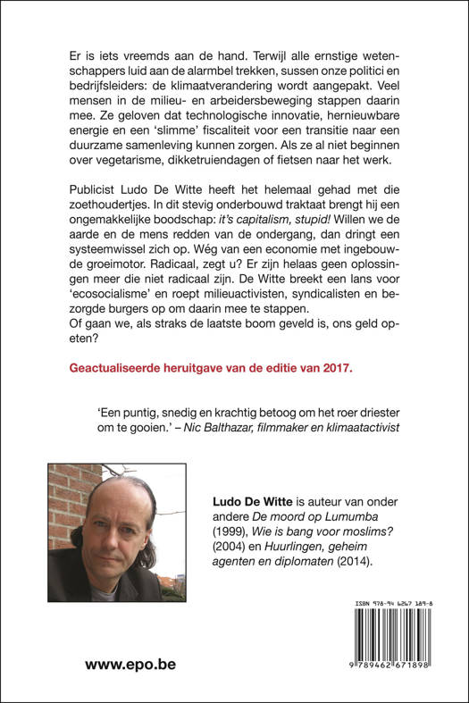 Er is iets vreemds aan de hand. Terwijl alle ernstige wetenschappers luid aan de alarmbel trekken, sussen onze politici en bedrijfsleiders: de klimaatverandering wordt aangepakt. Veel mensen in de milieu- en arbeidersbeweging stappen daarin mee. Ze geloven dat technologische innovatie, hernieuwbare energie en een ‘slimme’ fiscaliteit voor een transitie naar een duurzame samenleving kunnen zorgen. Als ze al niet beginnen over vegetarisme, dikketruiendagen of fietsen naar het werk. Publicist Ludo De Witte heeft het helemaal gehad met die zoethoudertjes. In dit stevig onderbouwd traktaat brengt hij een ongemakkelijke boodschap: it’s capitalism, stupid! Willen we de aarde en de mens redden van de ondergang, dan dringt een systeemwissel zich op. Wég van een economie met ingebouwde groeimotor. Radicaal, zegt u? Er zijn helaas geen oplossingen meer die niet radicaal zijn. De Witte breekt een lans voor ‘ecosocialisme’ en roept milieuactivisten, syndicalisten en bezorgde burgers op om daarin mee te stappen. Of gaan we, als straks de laatste boom is geveld, ons geld opeten? Geactualiseerde heruitgave van de editie van 2017.