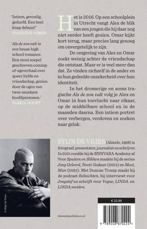 In het dromerige en soms tragische Als de zon valt volg je Alex en Omar in hun toevlucht naar elkaar, op de middelbare school en in de maanden daarna. Een intiem portret over verbergen, verdoven en zoeken naar geluk.