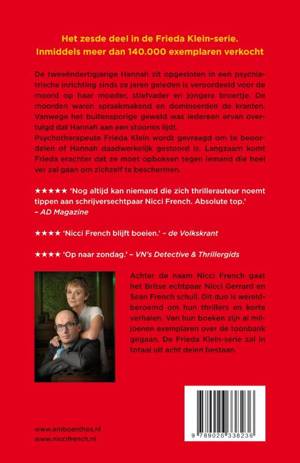 • Blauwe maandag • Dinsdag is voorbij • Wachten op woensdag • Donderdagskinderen • Denken aan vrijdag • Als het zaterdag wordt • Zondagochtend breekt aan • De dag van de doden 'Nicci French blijft boeien.'- vier sterren, de Volkskrant 'Nog altijd kan niemad die zich thrillerauteur noemt tippen aan schrijversechtpaar Nicci French. Absolute top.'- 5 sterren, AD 'Dat is hét talent van dit schrijversechtpaar; ze zijn meesters in het oproepen van beklemming en doem.'- Trouw