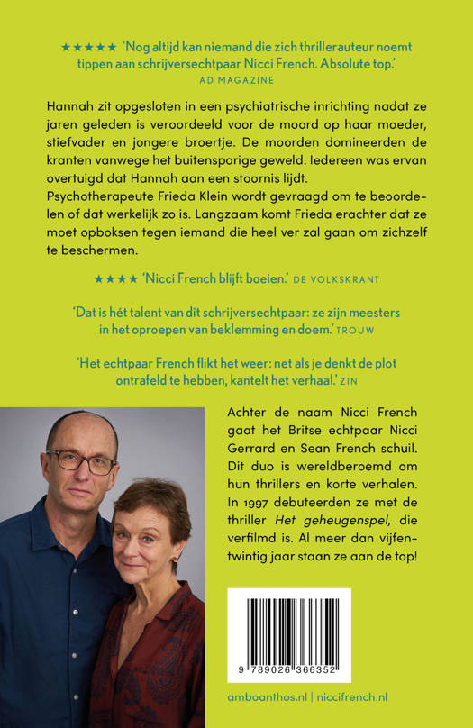 'Nog altijd kan niemad die zich thrillerauteur noemt tippen aan schrijversechtpaar Nicci French. Absolute top.'- 5 sterren, AD