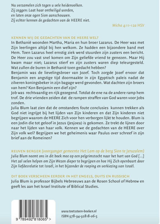 Julia Blum laat zien dat de omstanders foute conclusies kunnen trekken als God niet ingrijpt bij het lijden van Zijn kinderen en dat Zijn kinderen niet begrijpen waarom de HEERE Zich voor hen verborgen lijkt te houden. Blum is een Jodin die tot geloof in Jezus (Jesjoea) is gekomen. Ze trekt de lijnen door naar het lijden van haar volk. Kennen we de gedachten van de HEERE over Zijn volk wel? Begrijpen we het geheimenis waar Paulus over schreef in zijn brief aan de Romeinen?