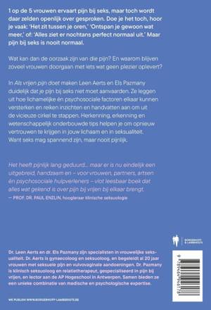 Wat kan dan de oorzaak zijn van die pijn? En waarom blijven zoveel vrouwen doorgaan met iets wat geen plezier oplevert? In Als vrijen pijn doet maken Leen Aerts en Els Pazmany duidelijk dat je pijn bij seks niet moet aanvaarden. Ze leggen uit hoe lichamelijke én psychosociale factoren elkaar kunnen versterken en reiken inzichten en handvatten aan om uit de vicieuze cirkel te stappen. Herkenning, erkenning en wetenschappelijk onderbouwde tips helpen je om opnieuw vertrouwen te krijgen in jouw lichaam en in seksualiteit. Want seks mag spannend zijn, maar nooit pijnlijk.