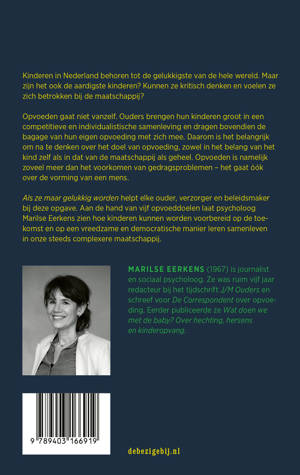 Als ze maar gelukkig worden helpt elke opvoeder in deze zoektocht. Aan de hand van vijf opvoeddoelen laat Eerkens zien hoe kinderen kunnen worden voorbereid op de toekomst en op een vreedzame en democratische manier leren samenleven in onze steeds complexere maatschappij.