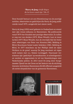Deze bundel bestaat uit een bloemlezing van de puntige notities, observaties en gedichtjes die Harry de Jong publiceerde vanaf 1975, aangevuld met nieuw werk.