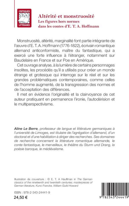 Monstruosité, altérité, marginalité font partie intégrante de l’oeuvre d’E. T. A. Hoffmann, écrivain romantique allemand anticonformiste, maître du fantastique, qui a exercé une forte influence à l’étranger, notamment sur Baudelaire en France et sur Poe en Amérique. Cet ouvrage analyse, à la lumière de certains personnages insolites, les procédés qu’il a utilisés pour créer un monde étrange et grotesque qui interroge sur le réel et sur les grandes problématiques contemporaines, comme celles de l’homme augmenté, de la transgression des normes et de l’acceptation des différences. Il met en évidence l’originalité et la clairvoyance de cet auteur pratiquant en permanence l’ironie, l’autodérision et le multiperspectivisme.