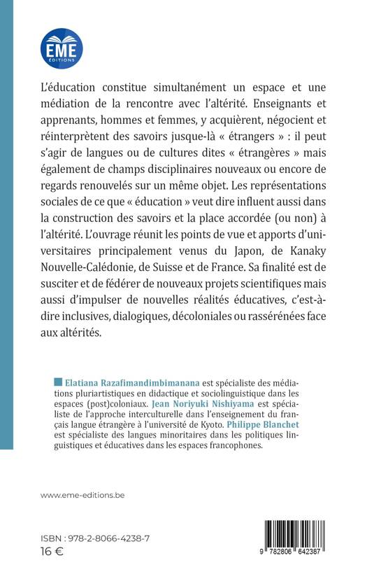 L'éducation constitue simultanément un espace et une médiation de la rencontre avec l'altérité. Enseignants et apprenants, hommes et femmes, y acquièrent, négocient et réinterprètent des savoirs jusque-là étrangers: il peut s'agir de langues ou de cultures dites étrangères mais également de champs disciplinaires nouveaux ou encore de regards renouvelés sur un même objet. Les représentations sociales de ce que éducation veut dire influent aussi dans la construction des savoirs et la place accordée (ou non) à l'altérité. L'ouvrage réunit les points de vue et apports d'universitaires principalement venus du Japon, de Kanaky Nouvelle Calédonie, de Suisse et de France. Sa finalité est de susciter et de fédérer de nouveaux projets scientifiques mais aussi d'impulser de nouvelles réalités éducatives, c'est-à-dire inclusives, dialogiques, décoloniales ou rassérénées face aux altérités.