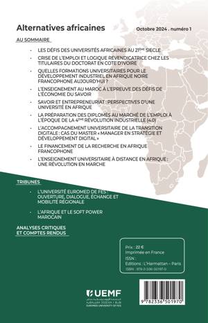 La revue Alternatives africaines se veut un organe d'étude totalement dédié aux questions et enjeux qui se posent en Afrique. Lancée par l'Université Euro Méditerranéenne de Fès (UEMF), elle démontre le grand intérêt que portent le Maroc et l'Université pour l'Afrique. Consacrer le premier numéro de la revue à la question de l'enseignement supérieur en Afrique témoigne de la conviction des responsables de l'UEMF de l'importance cruciale du rôle de l'Université et de la recherche scientifique dans tout le processus de renaissance africaine et dans tout projet de développement économique, politique et social.