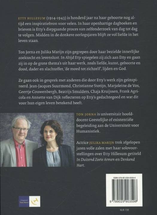 Etty Hillesum (1914-1943) is honderd jaar na haar geboorte nog altijd een inspiratiebron voor velen. In haar openhartige dagboeken en brieven is Etty's diepgaande proces van zelfonderzoek van dag tot dag te volgen. Midden in de donkere oorlogsjaren blijft ze vol liefde in het leven staan. Ton Jorna en Julika Marijn zijn gegrepen door haar bezielde innerlijke zoektocht en levenslust. In 'Altijd Etty' spiegelen zij zich aan Etty en gaan zij in op de grote thema's uit haar werk, zoals liefde, kunst, geboorte en dood, dader en slachtoffer, 'de moed tot zichzelf', lijden en God. Ze gaan ook in gesprek met anderen die door Etty's werk zijn geïnspireerd. Jean-Jacques Suurmond, Christianne Stotijn, Marjoleine de Vos, Geertje Couwenbergh, Beatrijs Smulders, Chaja Kruijssen, Frank Agricola en Annette van Dijk reflecteren op Etty's gedachtegoed en wat dit voor hun eigen leven betekend heeft.