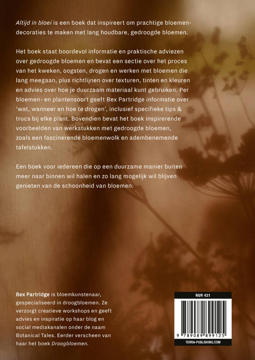 Per bloemen- en plantensoort geeft Partridge informatie over 'wat, wanneer en hoe te drogen', inclusief specifieke tips & trucs bij elke plant. Altijd in bloei inspireert om prachtige bloemendecoraties te maken met lang houdbare, gedroogde bloemen, en is een must voor iedereen die buiten meer naar binnen wil halen en dat zo duurzaam mogelijk wil doen.