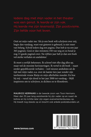 Een warm eerbetoon van Maurice Hermans aan zijn vader Toon Iedere dag met mijn vader in het theater was een genot. Ik leerde er zijn vak. Hij leerde me zijn levensstijl. Zijn positivisme. Zijn liefde voor het leven. Ooit zei mijn vader me: 'Als je een boek wilt schrijven over mij, begin dan vandaag, want wat gisteren is gebeurd, is niet meer van belang. Schrijf iedere dag een pagina. Dan heb je na een jaar 365 pagina's. Gooi er dan minstens 350 van weg en zo houd je nog 15 goede pagina's over. Na vijftien jaar heb je dan een boek vol sterke verhalen en anekdotes Ik moet u eerlijk bekennen: ik schreef niet elke dag alles op, maar wel de mooiste herinneringen. Ik vertel in dit boek - naast eerder gepubliceerde verhalen - veel nieuwe anekdotes uit de tijd met mijn vader, over de laatste tien jaar zonder zijn teerbeminde vrouw Rietje en hoe hij me - vanaf zijn dood in het jaar 2000 tot vandaag - blijft inspireren om te schrijven, te dichten en te filosoferen;