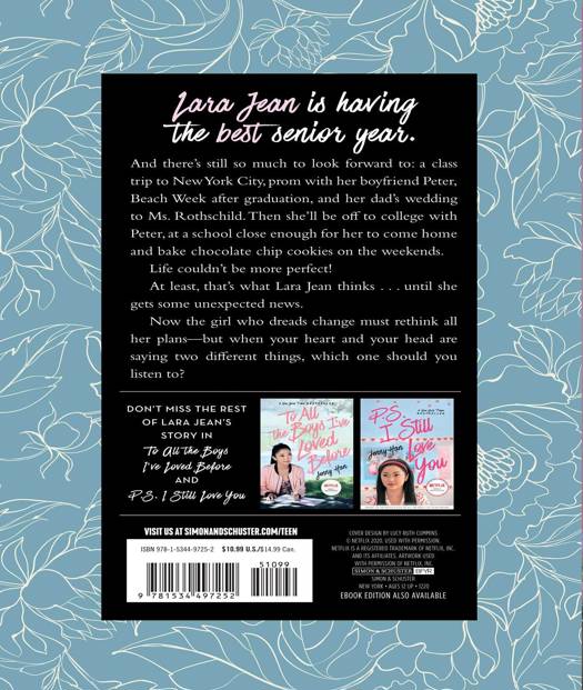 But change is looming on the horizon. And while Lara Jean is having fun and keeping busy helping plan her father's wedding, she can't ignore the big life decisions she has to make. Most pressingly, where she wants to go to college and what that means for her relationship with Peter. She watched her sister Margot go through these growing pains. Now Lara Jean's the one who'll be graduating high school and leaving for college and leaving her family--and possibly the boy she loves--behind.