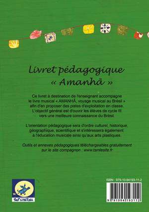 Ce livret à destination de l'enseignant accompagne le livre musical « AMANHÃ, voyage musical au Brésil » afin d'en proposer des pistes d'exploitation en classe. L'objectif général est d'ouvrir les élèves de cycle III vers une meilleure connaissance du Brésil. L'orientation pédagogique sera d'ordre culturel, historique, géographique, scientifique et s'intéressera également à l'éducation musicale ainsi qu'aux arts plastiques.