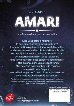 Amari Peters sait trois choses : 1. Son frère Quinton a disparu. 2. Personne ne semble s'en inquiéter. 3. La disparition de Quinton est liée à son travail. Quand elle trouve dans le placard de son frère une invitation à se rendre au mystérieux Bureau des affaires surnaturelles, Amari n'hésite pas. Et voilà qu'elle est reçue par un ascenseur parlant et rencontre une dragon-garou qui devine ses émotions ! Dans l'espoir de retrouver Quinton, Amari accepte de travailler pour le Bureau, dont la mission est de réguler le monde surnaturel. Elle fait alors une découverte qui va bouleverser sa vie. Son frère était un célèbre agent chargé de traquer les magiciens, considérés comme les ennemis du Bureau. Désormais, c'est à la jeune fille de prendre la relève.