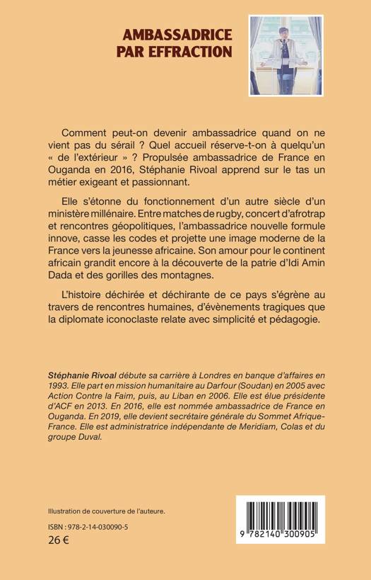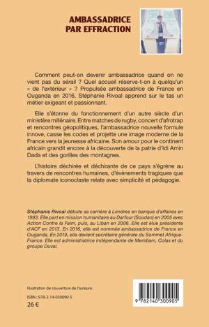 Comment peut-on devenir ambassadrice quand on ne vient pas du sérail ? Quel accueil réserve-t-on à quelqu'un de l'extérieur Propulsée ambassadrice de France en Ouganda en 2016, Stéphanie Rivoal apprend sur le tas un métier exigeant et passionnant. Elle s'étonne du fonctionnement d'un autre siècle d'un ministère millénaire. Entre matches de rugby, concert d'afrotrap et rencontres géopolitiques, l'ambassadrice nouvelle formule innove, casse les codes et projette une image moderne de la France vers la jeunesse africaine. Son amour pour le continent africain grandit encore à la découverte de la patrie d'Idi Amin Dada et des gorilles des montagnes. L'histoire déchirée et déchirante de ce pays s'égrène au travers de rencontres humaines, d'évènements tragiques que la diplomate iconoclaste relate avec simplicité et pédagogie.