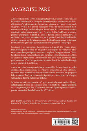 Ambroise Paré (1510-1590), chirurgien et écrivain, a traversé son siècle dans le contexte tumultueux et changeant de la France de la Renaissance. Barbier - chirurgien d’origine modeste, il entre tour à tour au service de trois grands seigneurs, avant d’être promu chirurgien ordinaire du roi Henri II. Reçu maitre en chirurgie par le Collège de Saint-Côme, il conserve ses fonctions auprès des trois souverains suivants : François II, Charles IX, qui le nomme premier chirurgien, et Henri III dont il devient l’un des conseillers. Ses qualités d’observation, sa curiosité, sa participation à plus de quinze batailles et sièges pendant les dernières guerres d’Italie et les guerres de religion en font un témoin privilégié des évènements marquants de son époque.